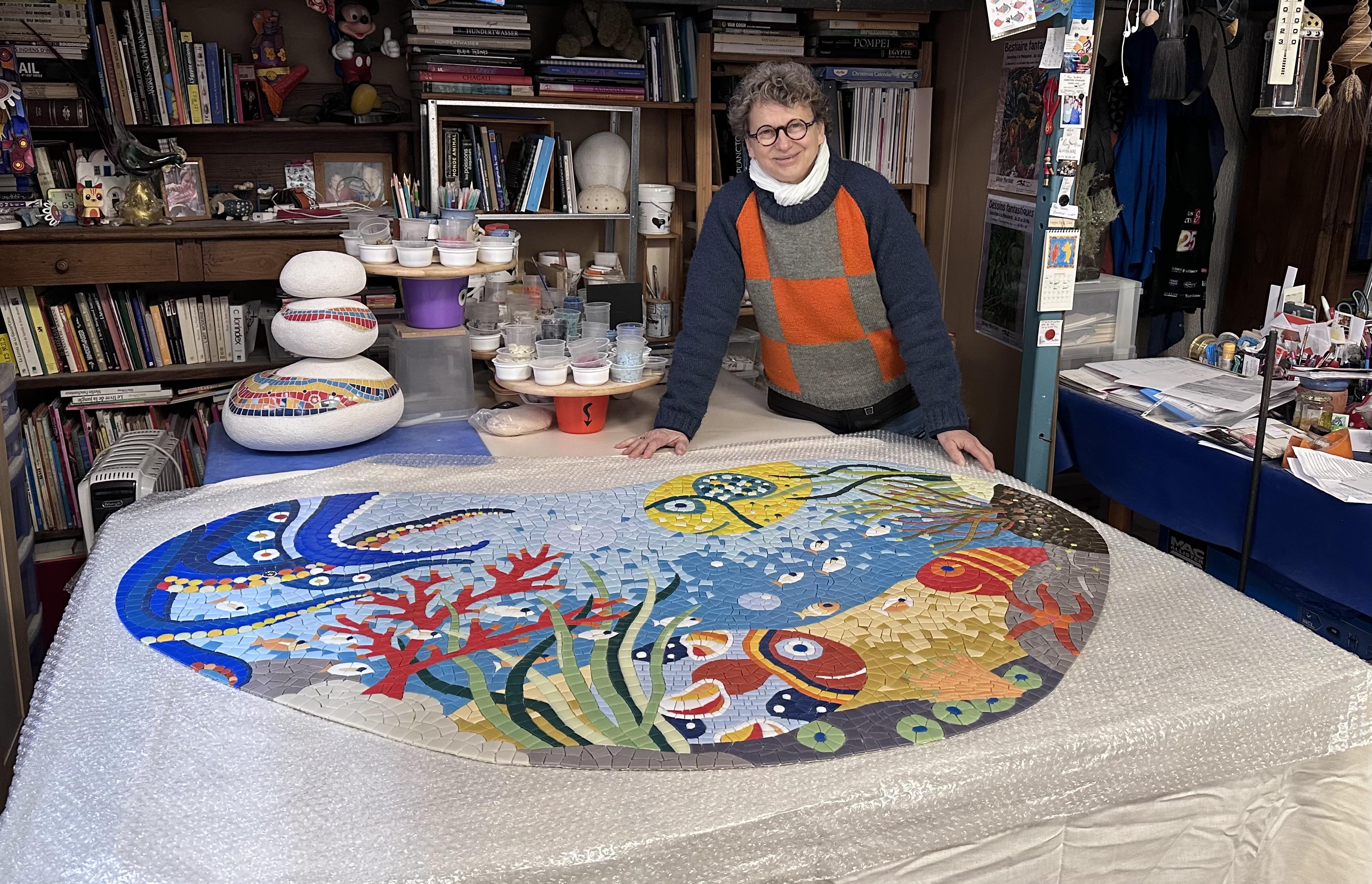 Avec une prédilection pour le thème de la mer et des paysages sous-marins, Sylvie Bérard conçoit, réalise sur commande et pose des mosaïques originales destinées à l’habillage de murs, de sols.